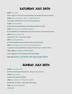 Friday Night will be the first ever Mason City corn hole tournament in the beer garden on Main Street, along with a Teen Dance. Most of the weekend’s events will take place at the Community Building, Sims Park, or on Main Street. Money raised from some of the festivities will go toward the Mason City Village (MCV) street project.