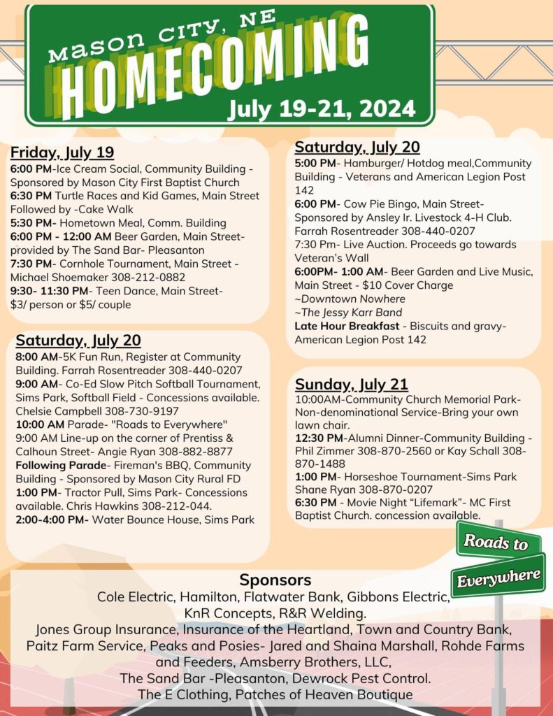On Sunday, community church begins in memorial park at 10 a.m. It is a non-denominational service and they ask that you bring your own chair. At 12:30 is the Alumni dinner and at 1 is the horseshoe tournament at Sims Park. To register for the tournament contact Shane Ryan at (308) 870-0207.
