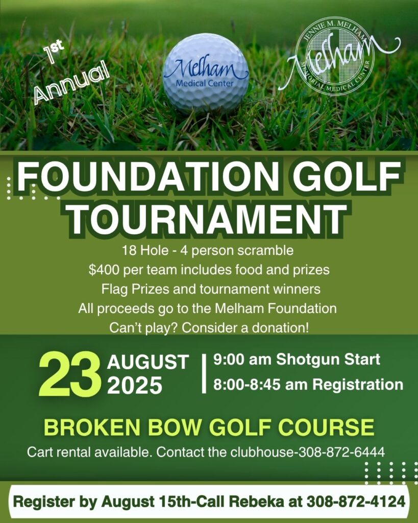To contribute, ask questions, or register a team, contact Rebeka Anderson at (308) 872-4124 or [email protected]. Any contributions must be made before August 1. All proceeds of the tournament will go to the Melham Medical Center Foundation.