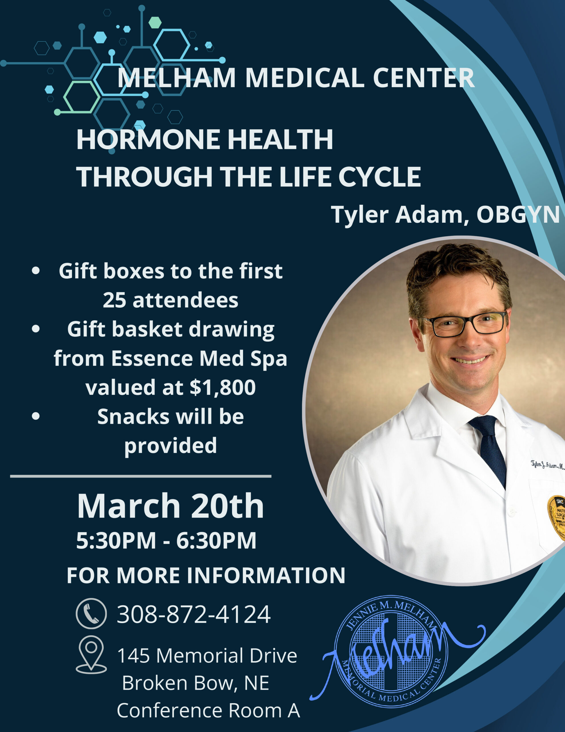 Melham Medical Center is inviting the community to an informational presentation with Dr. Tyler Adam, OBGYN titled “Hormone Health Through the Life Cycle”. The event is set for this Thursday (March 20) starting at 5:30 PM in Conference Room A at the hospital in Broken Bow.