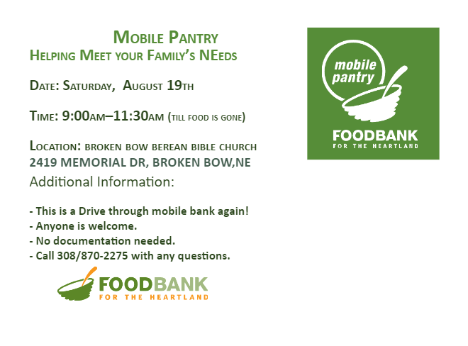 BROKEN BOW – The Food Bank of the Heartland will once again return to Broken Bow, this time in the parking lot of the Berean Bible Church at 9 a.m. on Saturday, August 19.