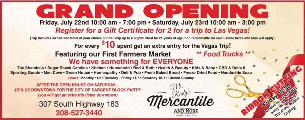 SARGENT – The town of Sargent will officially welcome a new face to its family of businesses on Friday, July 22 at 10:30 a.m.: Mr. Rudy’s Mercantile.