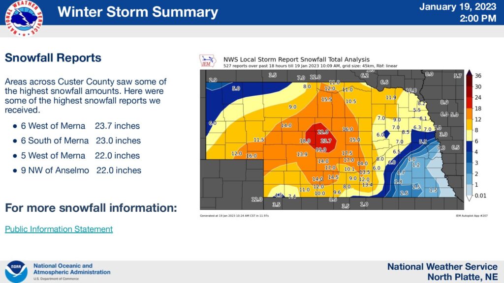The highest snowfall measurements were concentrated across portions of Custer County, with several locations receiving over 20 inches of snowfall. Below is a list of storm total snow accumulations provided by the National Weather Service as of 10AM CT Thursday.