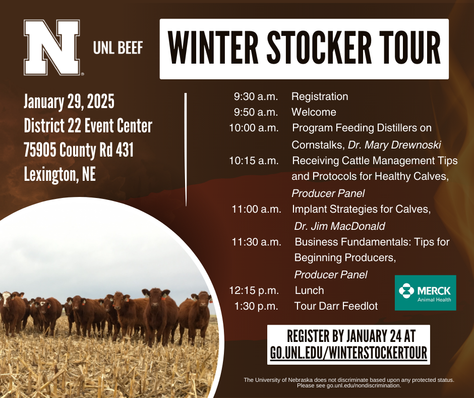 After hearing a desire for a winter stocker tour for gaining insight on cost-effective options to background calves through the winter, Nebraska Extension is holding a Winter Stocker Tour on January 29 near Lexington.