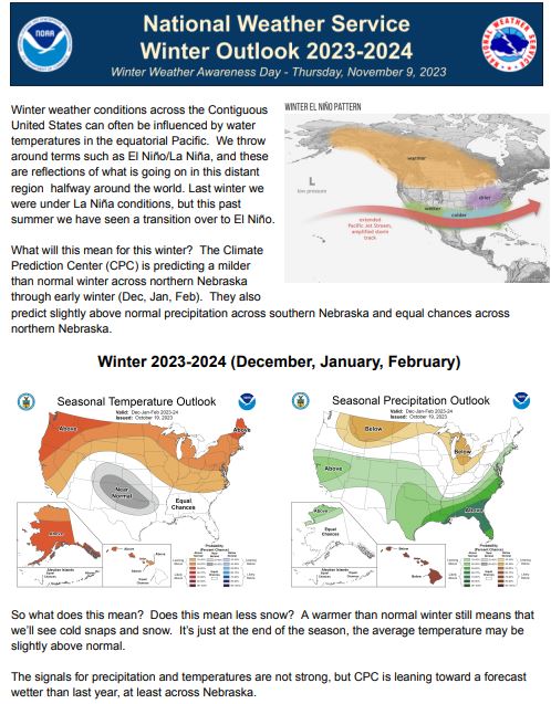 With the ongoing drought across portions of Nebraska, we know many are hoping for more precipitation this winter. Check out the winter forecast from the Climate Prediction Center, forecasting what we might expect for the Winter season. This outlook is not a forecast for individual storms moving across the region, but rather a snapshot of the whole season.