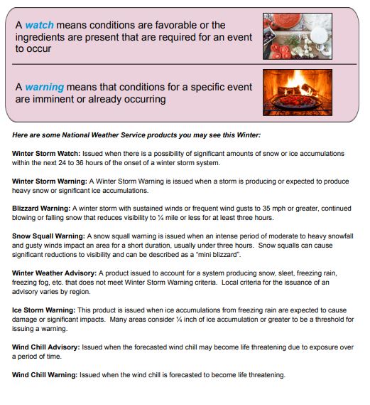 Make sure you and your family are prepared for winter weather before the storm. Refresh yourself on the “lingo” of winter storms, and make sure you have your safety kits stocked at your home AND in your car. You don’t want to be caught with empty shelves so start planning now to keep you and your family safe.