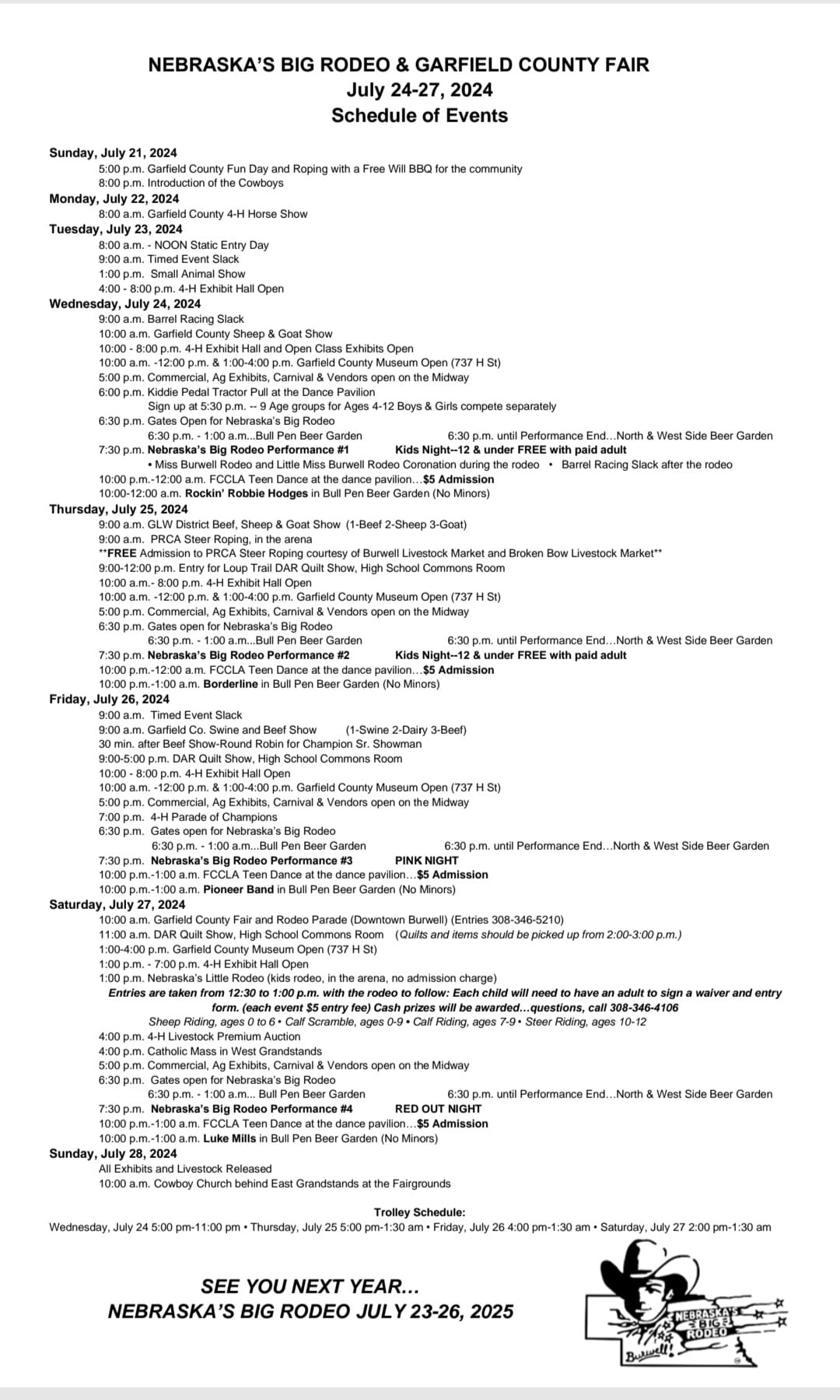 Events for Nebraska’s Big Rodeo and the Garfield County Fair began this past Sunday and eclipse an entire week until this Sunday. A main attraction each year is the rodeo performances, of which three remain for 2024. Performances two, three, and four are Thursday, Friday, and Saturday each beginning at 7:30 PM.