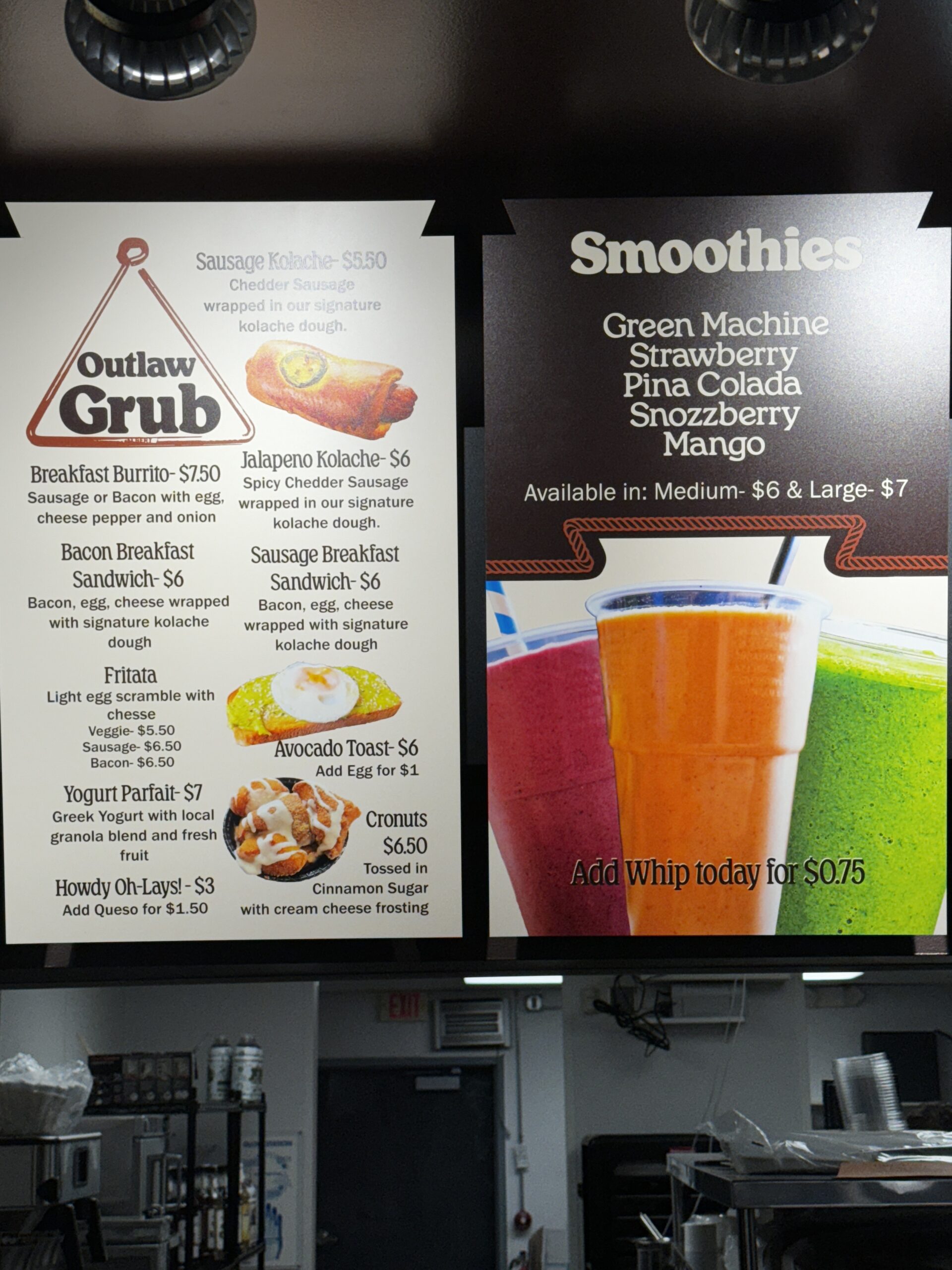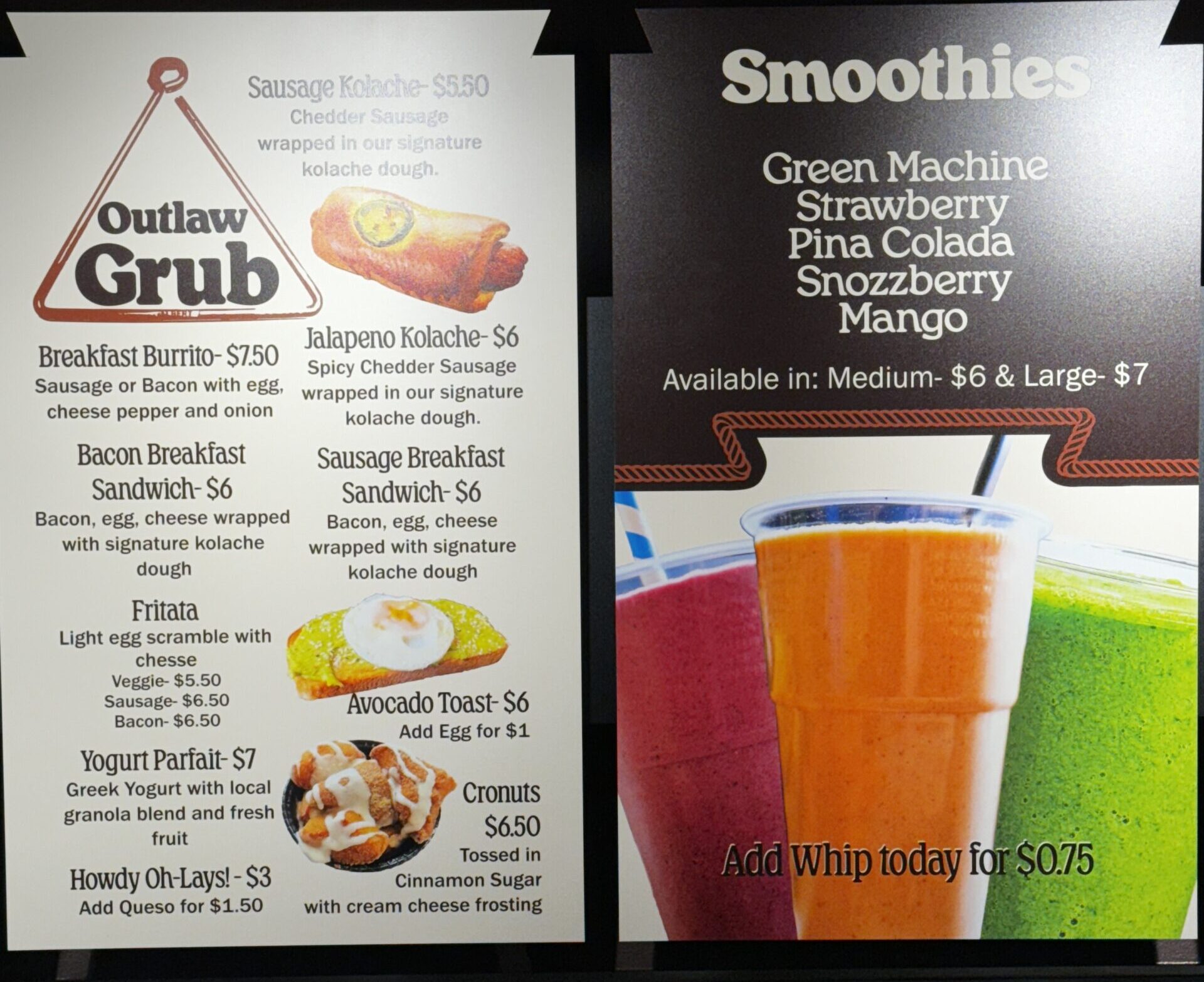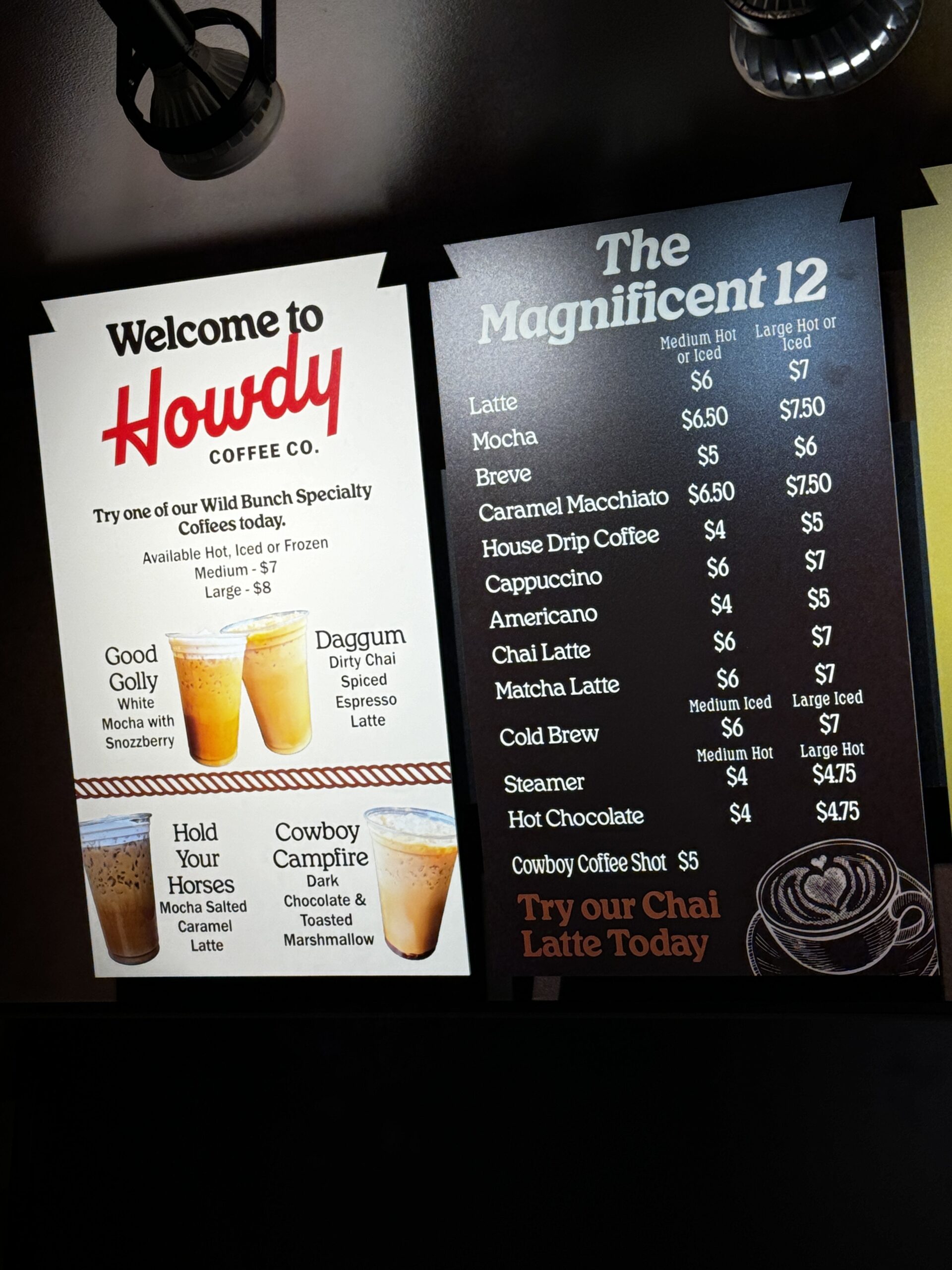 In addition to a classic black coffee, the drink menu features more than twelve classic coffee shop options as well as original Howdy Coffee creations.