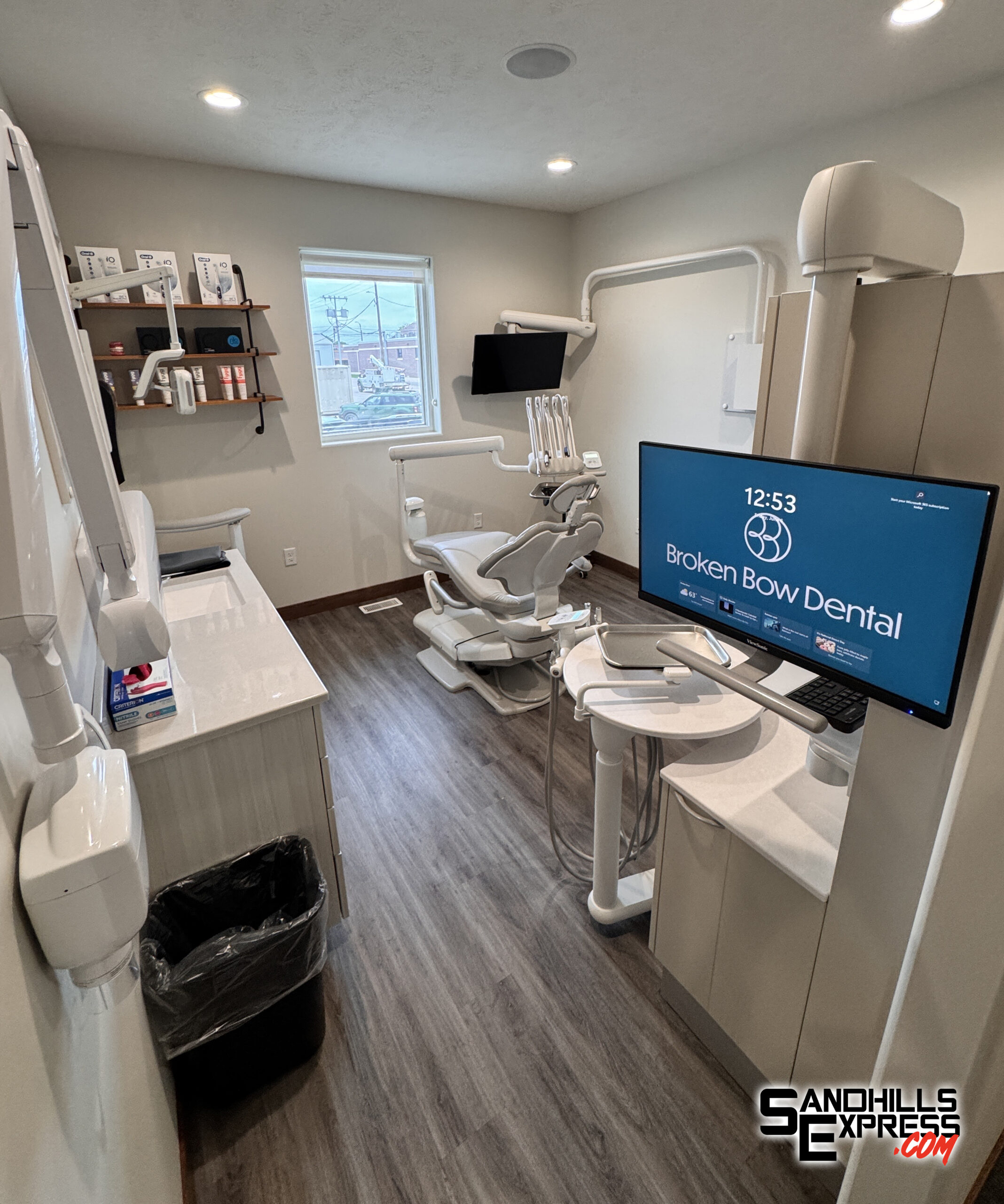 Broken Bow Dental officially opened their doors on May 14 after what McLeod said was overall a small amount of renovations to the former Nebraskaland Chiropractic building. During a tour of the building she pointed out two exam rooms ready for seeing patients, offices, an x-ray room, and rooms holding crown production and dental cleaning equipment. The front waiting room even sports a small crawl-through opening for kids with toys, a comfy chair, and TV inside.