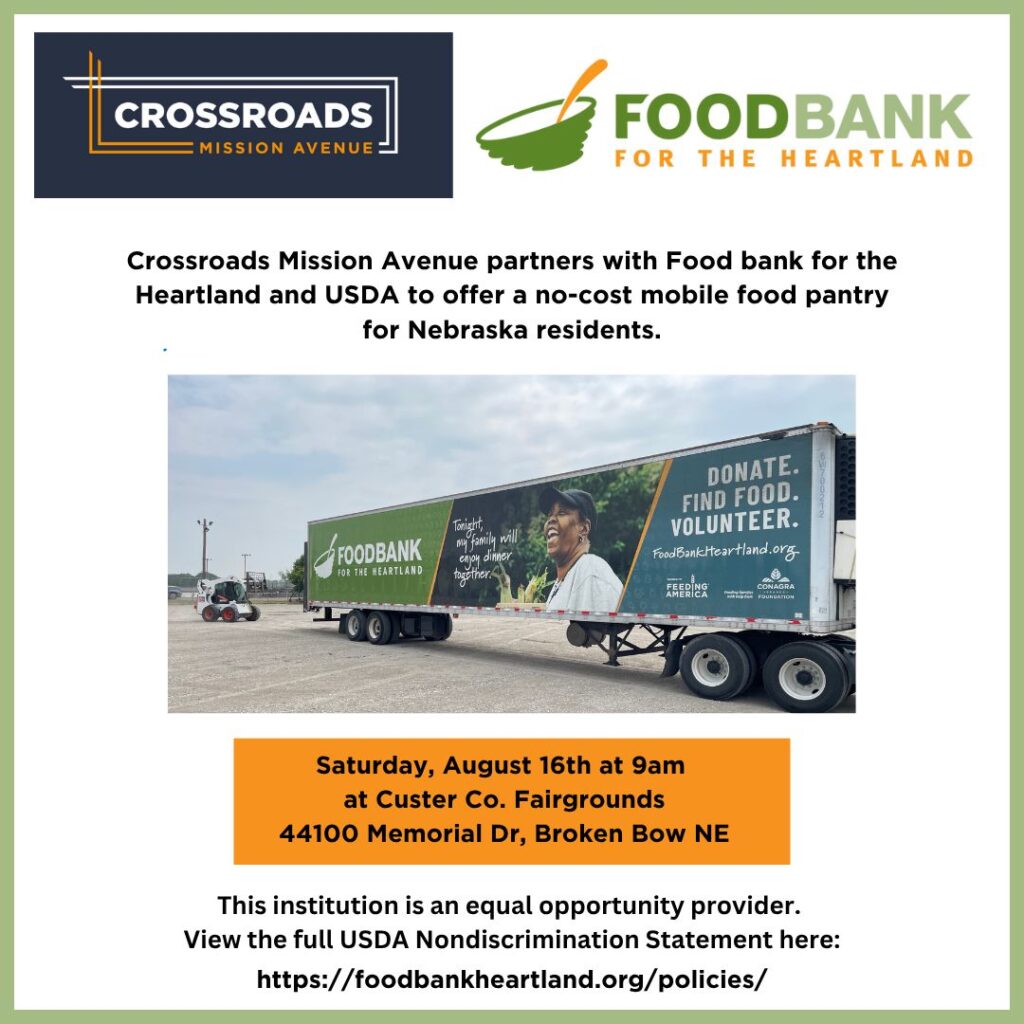 As a result of a partnership between Crossroads Mission Avenue, Food Bank for the Heartland, and the USDA, a no-cost mobile food pantry is coming to the Custer County Fairgrounds in Broken Bow.