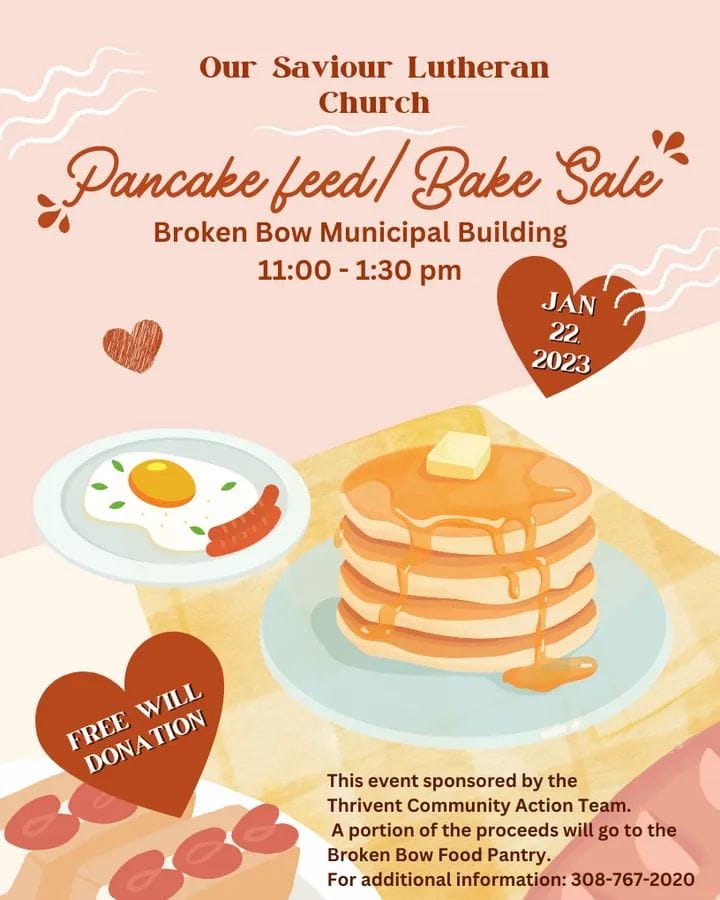 BROKEN BOW – Our Savior Lutheran Church’s annual pancake feed and bake sale has found a new, rescheduled date: it will take place on Sunday, February 12 between 11 a.m. and 1:30 p.m.