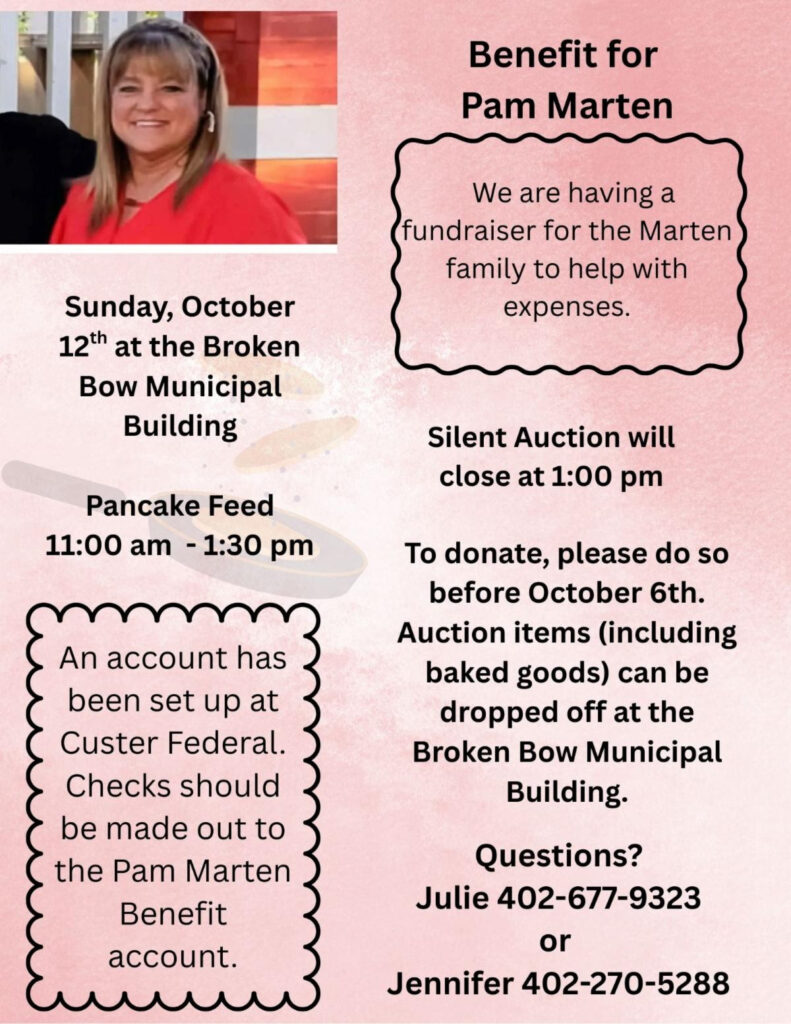 For those unable to make the benefit lunch, monetary donations can be provided at Custer Federal Bank in Broken Bow. Checks should be made to the Pam Marten Benefit account.