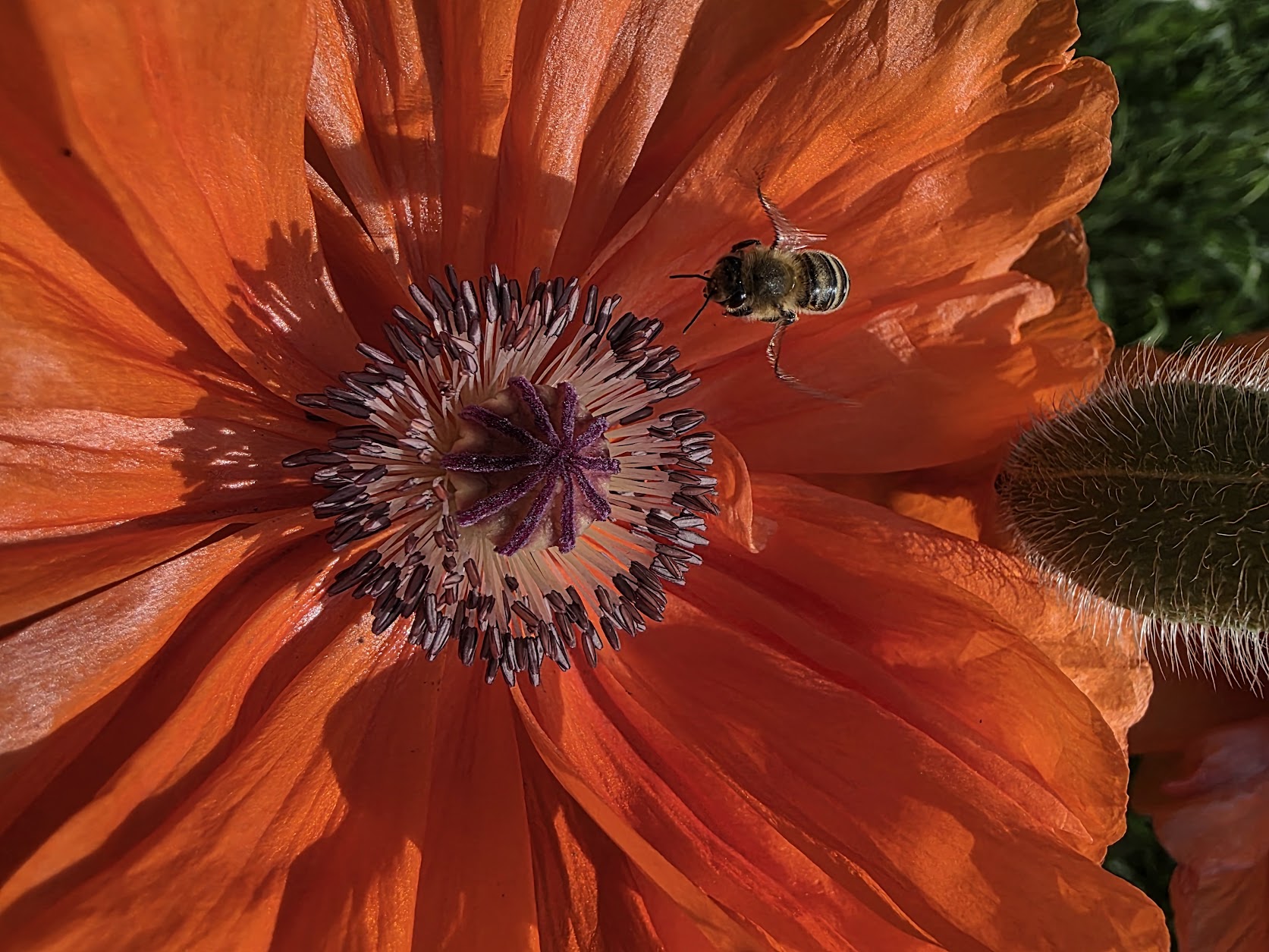 Lawrence Burman of Rockville won first place for his image of a deep blue, cloud-streaked sky reflected in the tranquil waters of the Middle Loup River in Sherman County. He also won third place for his photo of a bee hovering over a poppy.
