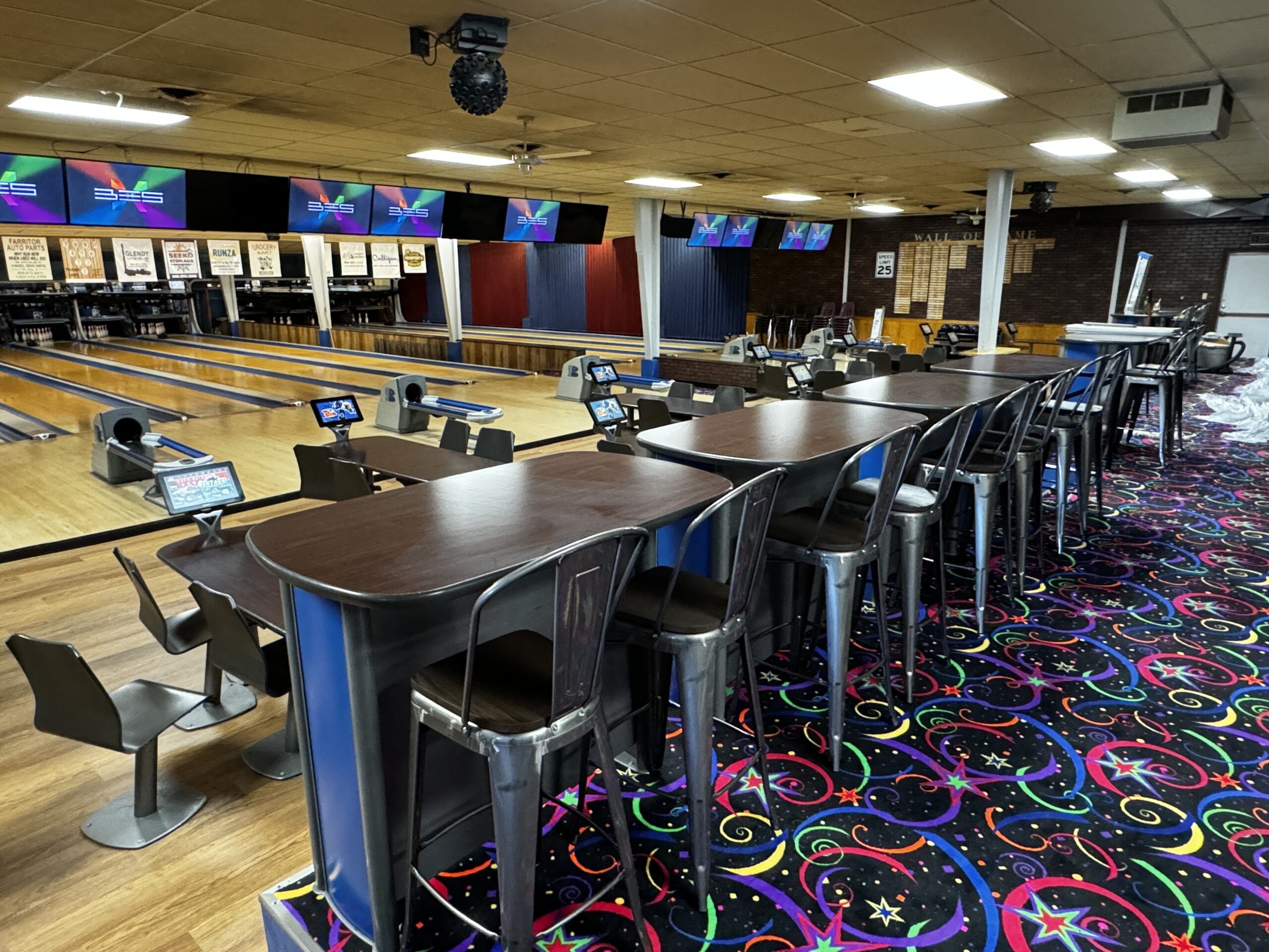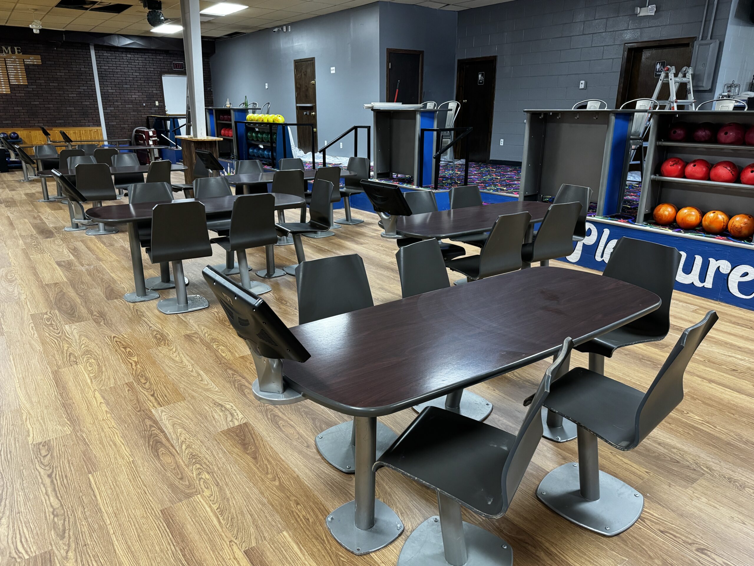 The now expanded area closest to the bowling lanes features easier-to-clean laminate flooring, while the upper area near the snack bar has bright themed carpet. The group tracked down a used set of high quality, durable Qubica bowling alley tables and chairs to fill the space.