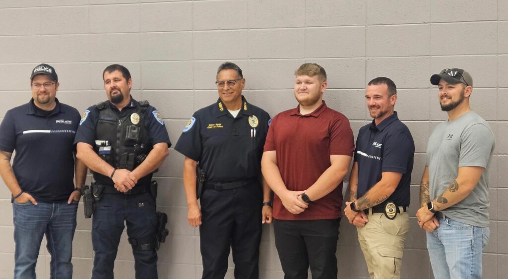 Wyatt Woodward stands with Broken Bow Police Chief Steve Scott and fellow officers on the Broken Bow Police Department