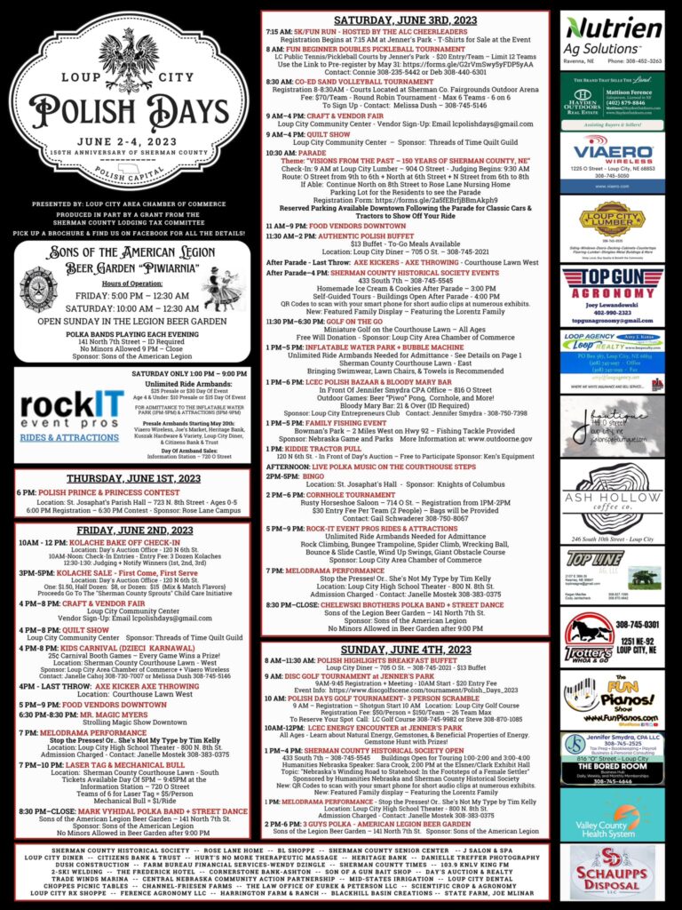 LOUP CITY – Loup City’s Polish Days celebration is set for June 2 through 4, the first weekend of the month. This year, it coincides with Sherman County’s 150th anniversary, and the Loup City Area Chamber of Commerce has put together a weekend with enough celebration for both milestones.