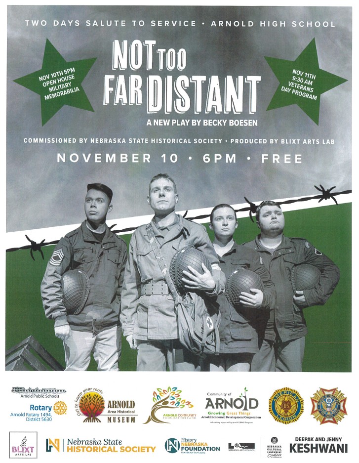 Not Too Far Distant performs on Monday, November 10th, at 6 pm at Arnold Public Schools. The production is presented by the William A Layton American Legion Post 130 and Auxiliary, Dean K. Leach Veterans of Foreign Wars Post 6157, Arnold Area Historical Society, Arnold Public Schools, and Arnold Community Foundation.