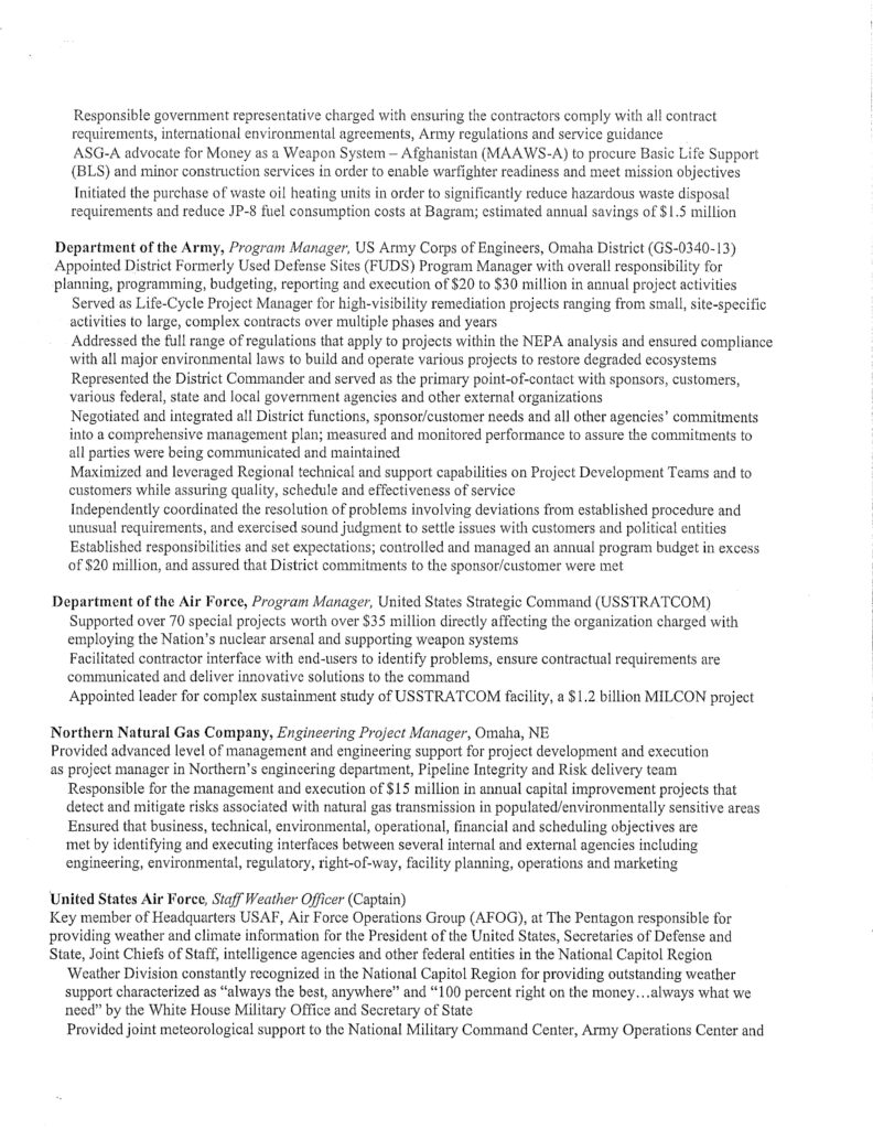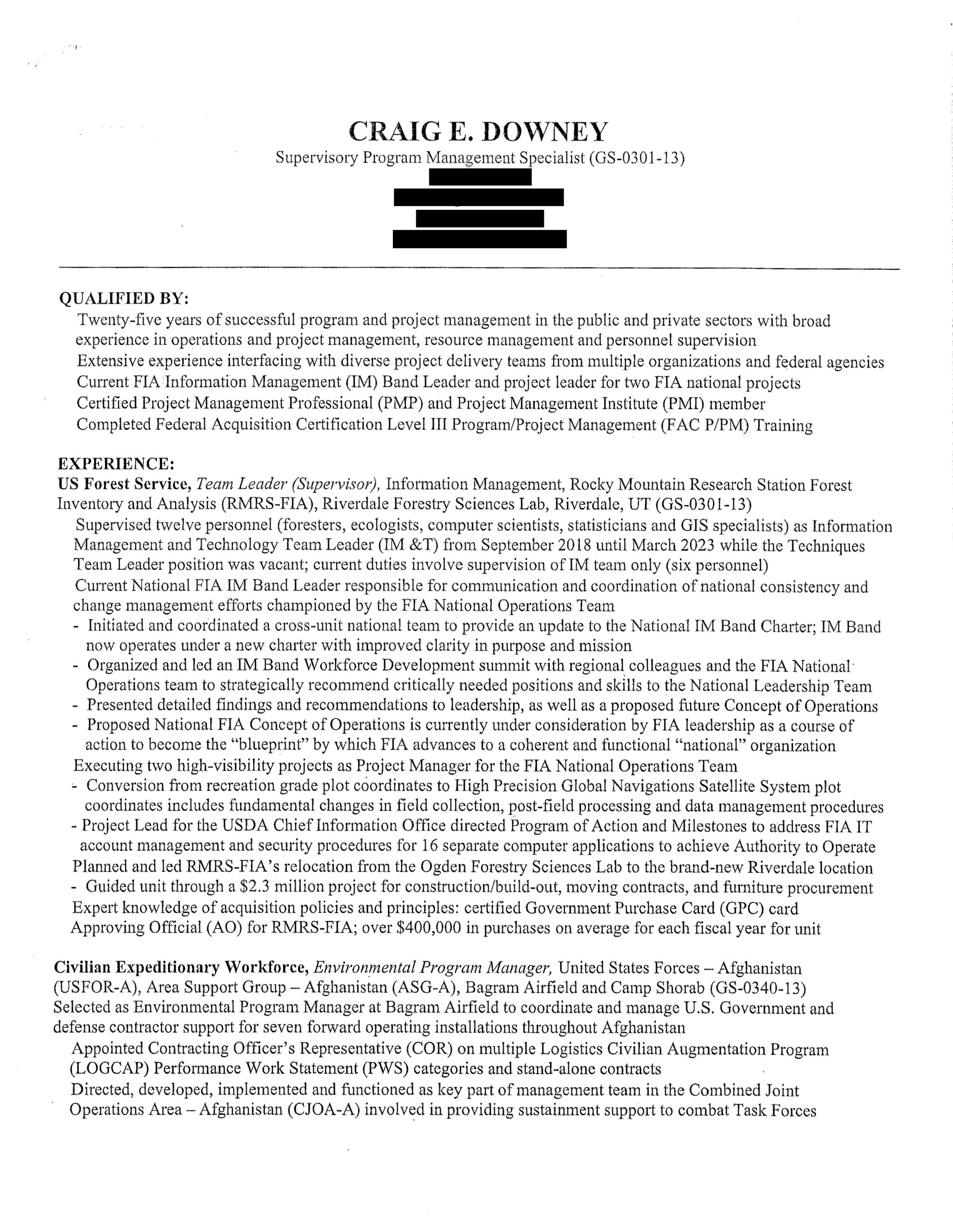 With a career of service eclipsing 25 years in the public and private sector, Downey worked and served with the US Forest Service as a team leader, the Civilian Expeditionary Workforce as an Environmental Program Manager, Department of the Army and Air Force as a Program Manager, Northern Natural Gas Company as an Engineering Project Manager, and the United States Air Force as a Staff Weather Officer.