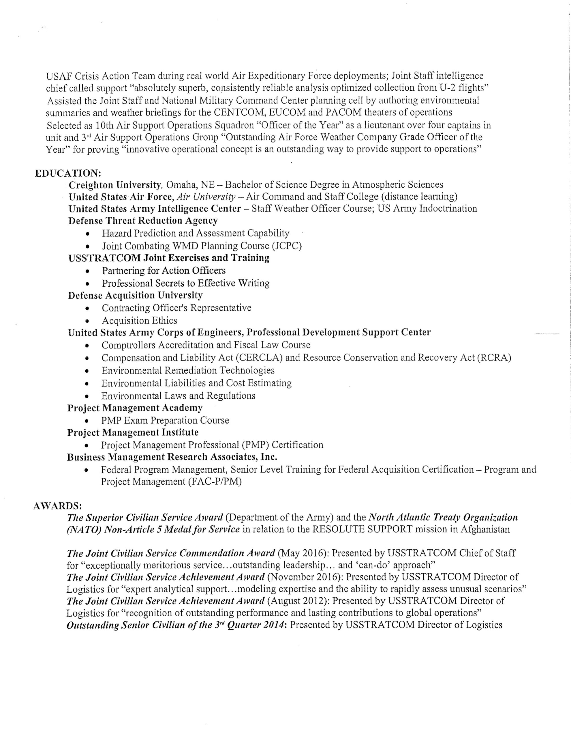In addition to graduating from Creighton University with a Bachelor of Science degree in Atmospheric Sciences, Downey added to his education at Air University with the United States Air Force, the United States Army Intelligence Center, and the United States Army Corps of Engineers to name a few.