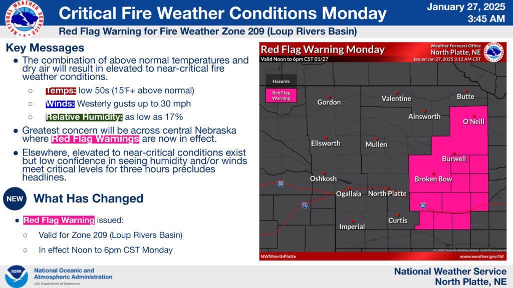 Custer County is included in the Red Flag Warning, as well as Burwell, O’Neill and areas south and east of Broken Bow. Temperatures climbing into the low 50’s, westerly winds gusting to 30 mph, and relative humidity as low as 17% have prompted the National Weather Service to issue the warning.
