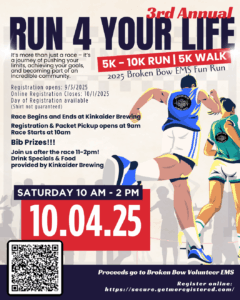 BROKEN BOW— Broken Bow EMS is inviting the public to participate in their third annual Run 4 Your Life 5k and 10k run and walk, as registrations opened September 3. Those wishing to participate can register until October 1 to be guaranteed a T-Shirt. Day-of registration is available, although a shirt is not guaranteed.