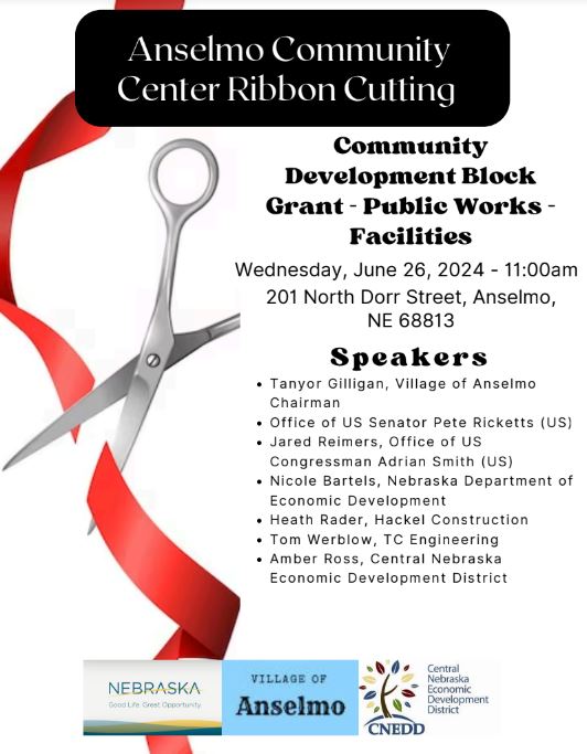 The ribbon cutting ceremony will include many speakers including Tanyor Gilligan, Village of Anselmo Chairman, Office of U.S. Senator Pete Ricketts, Jared Reimers from the Office of Congressman Adrian Smith, Nicole Bartels from the Nebraska Department of Economic Development, Heath Rader from Hackel Construction, Tom Werblow from TC Engineering, and Amber Ross from the Central Nebraska Economic Development District.