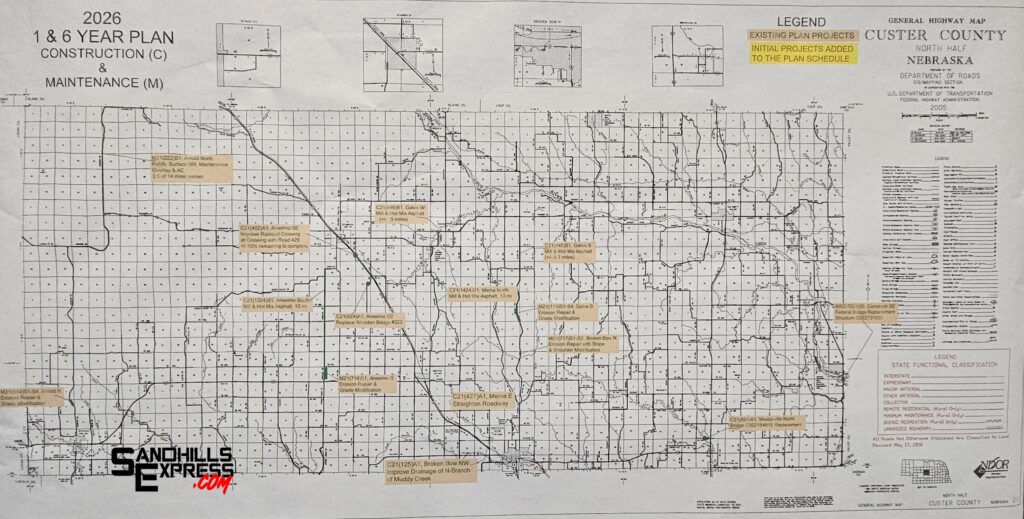The majority of the Supervisors time on Tuesday was spent receiving the annual report and 1- and 6 Year Construction and Maintenance Schedule from the Custer County Highway Department. Highway Superintendent Chris Jacobsen and Assistant County Road Superintendent Nick Olson were on hand to provide an overview of recently completed work on the county’s roads and bridges, and to provide a map for future work.
