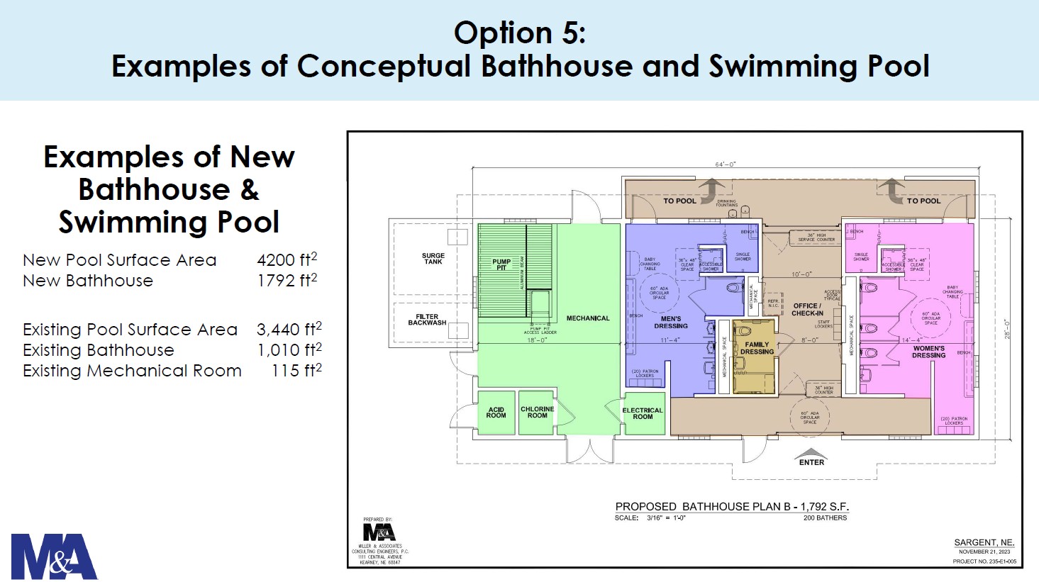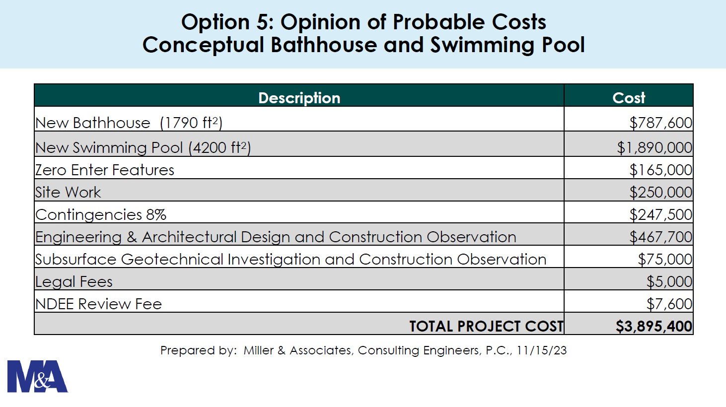 At the time of the study conducted in spring of 2024, the construction option chosen when forming the bond would cost $3,895,400. The plan would increase the pool size by just under 1,000 square feet and the bathhouse size by approximately 800 feet.