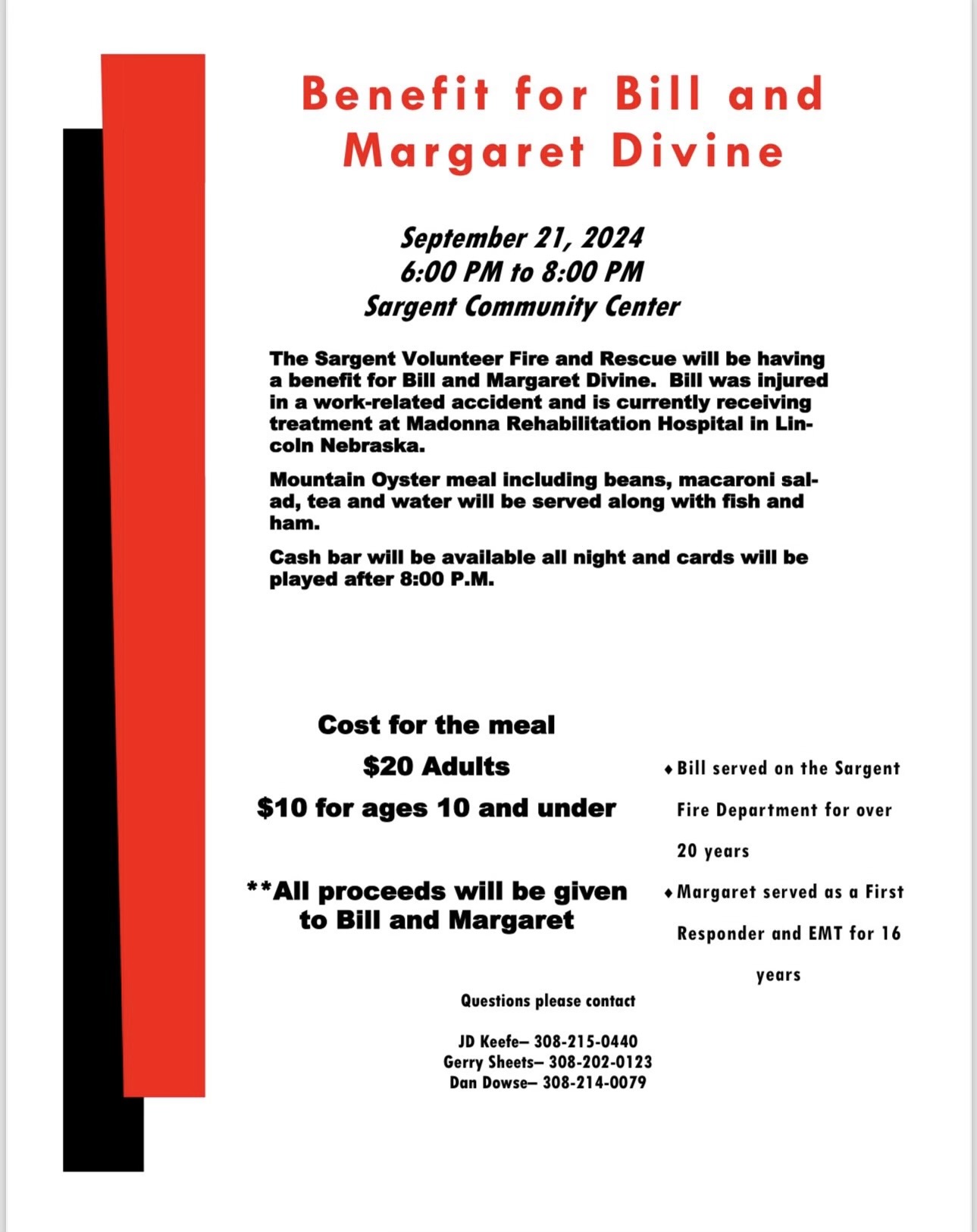 All proceeds from the event will be given to Bill and Margaret Divine. Bill was injured in a work-related accident and is currently receiving treatment at Madonna Rehabilitation Hospital in Lincoln. He served on the Sargent Fire Department for over 20 years, while his wife served as a first responder and EMT for 16 years.