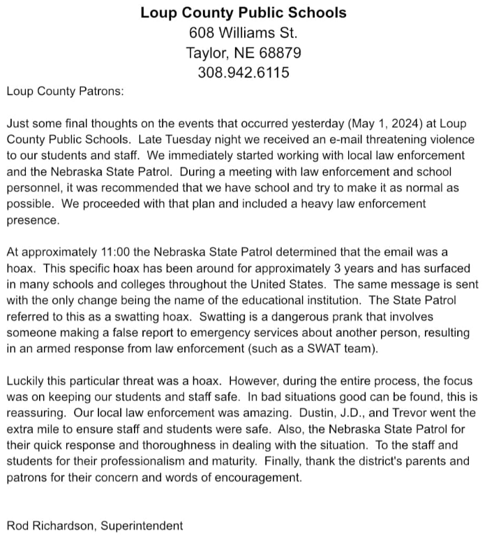 TAYLOR, NE – According to a statement released by Loup County Public Schools Superintendent Rod Richardson on Friday morning, the email threat toward students and staff earlier this week has been determined to be part of an ongoing hoax.