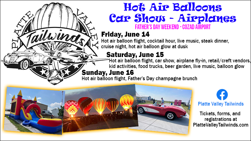 COZAD- The Platte Valley Tailwinds Festival is back in Cozad for its second year, this Father’s Day weekend. June 14-16 the Cozad Municipal Airport will host hot air balloons, car shows, airplane fly-ins, and more.