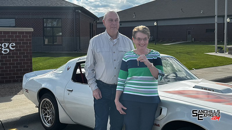 BROKEN BOW – Nancy Sedlacek was handed the keys to a pearl white 1979 Pontiac Trans Am on Monday afternoon in Broken Bow. Sedlacek was recently drawn as the winner of Mid Plains Community College’s annual classic car raffle.