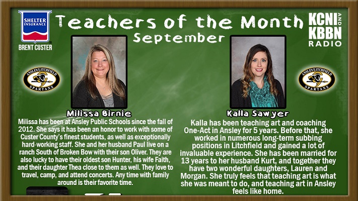 ANSLEY—As part of the Brent Custer Shelter Insurance Teacher of the Month Program, KCNI/KBBN would like to recognize the September Teachers of the Month Milissa Birnie and Kalla Sawyer!