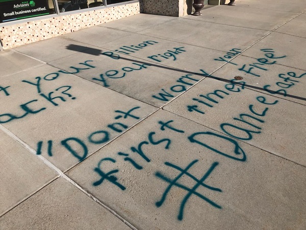 The phrases on the square included attacks to the D.A.R.E. Program, “Where does the money go?”, “Epstein didn’t kill himself”, and another phrase that was covered by the Broken Bow Fire Department Fireworks trailer. An additional phrase “Get your Billion Back? Yeah right. Don’t worry your first times free #dancesafe” was spray-painted in front of H&R Block.