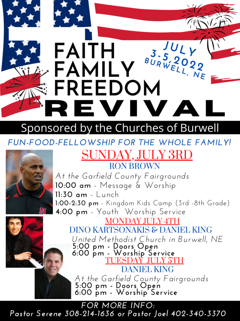 BURWELL – The Faith, Family, Freedom Revival, hosted by the churches of Burwell, gets underway over the holiday weekend, from Sunday, July 3 to Tuesday, July 5. The event promises “fun, food, and fellowship for the whole family,” and a number of speakers. This is the festival’s first year.