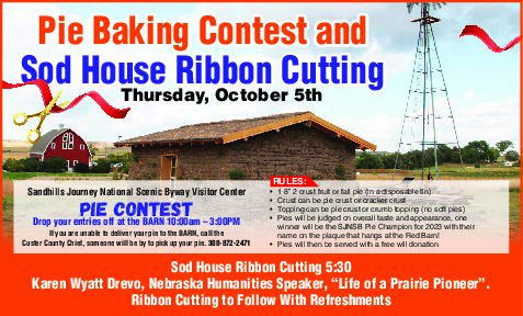 A ribbon cutting will take place at 5:30 pm on October 5 to celebrate the completion of the sod house. Not only will a ribbon cutting take place, but there will also be the exciting pie contest. Judging will start at 4:15 and those competing are invited to drop off the pies anywhere from 10 to 3pm.