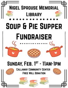 Callaway’s Nigel Sprouse Memorial Library will be hosting their annual Soup and Pie Supper Fundraiser Sunday, February 1. Lunch will be served starting at 11:00 AM to 1:00 PM at the Callaway Community Center.
