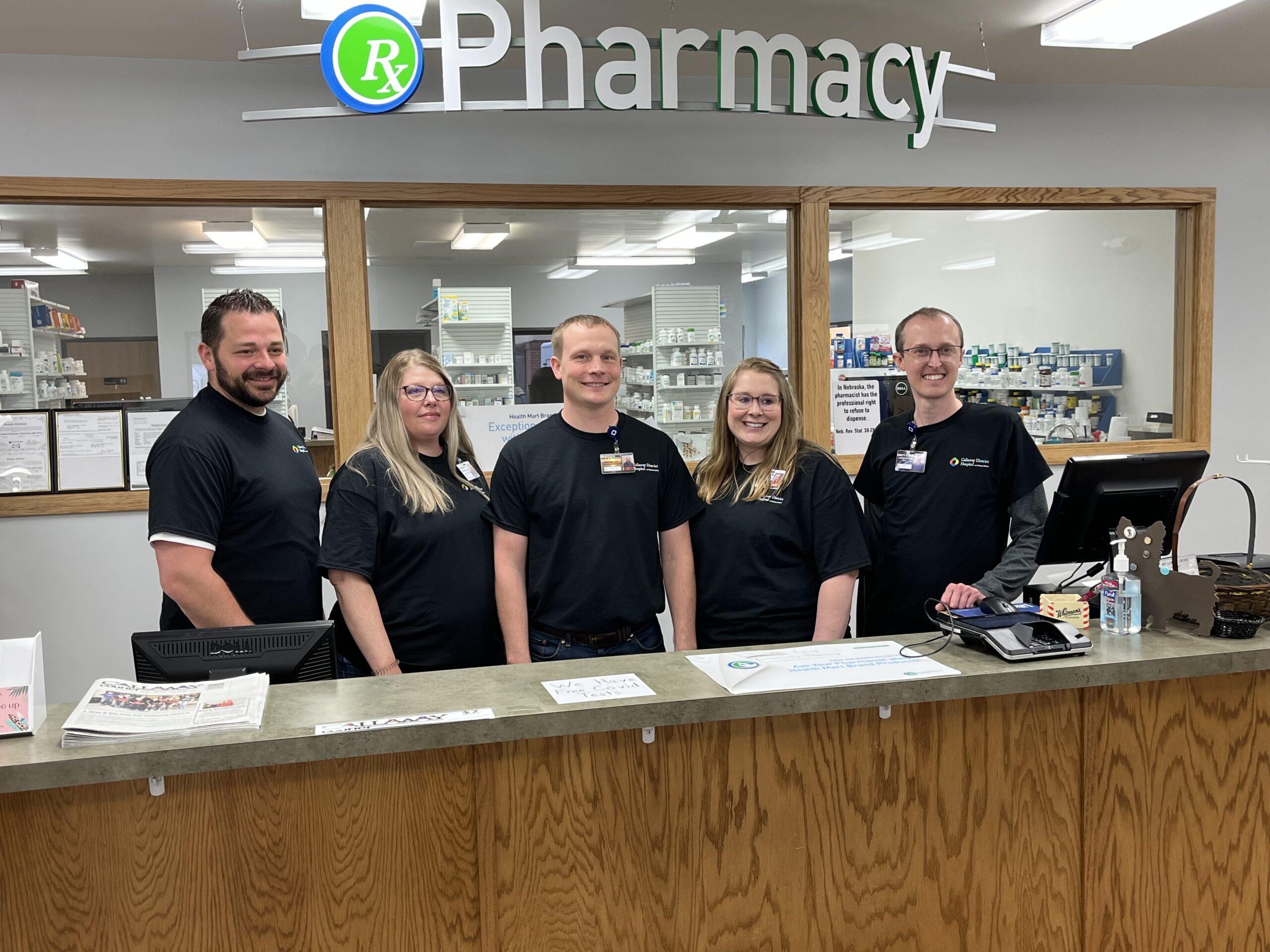The South Loup Pharmacy Staff (left to right): Caleb Poore, Brooke Dickman, Drew Smith, Crystal Malcom, and Brett Eggleston.
