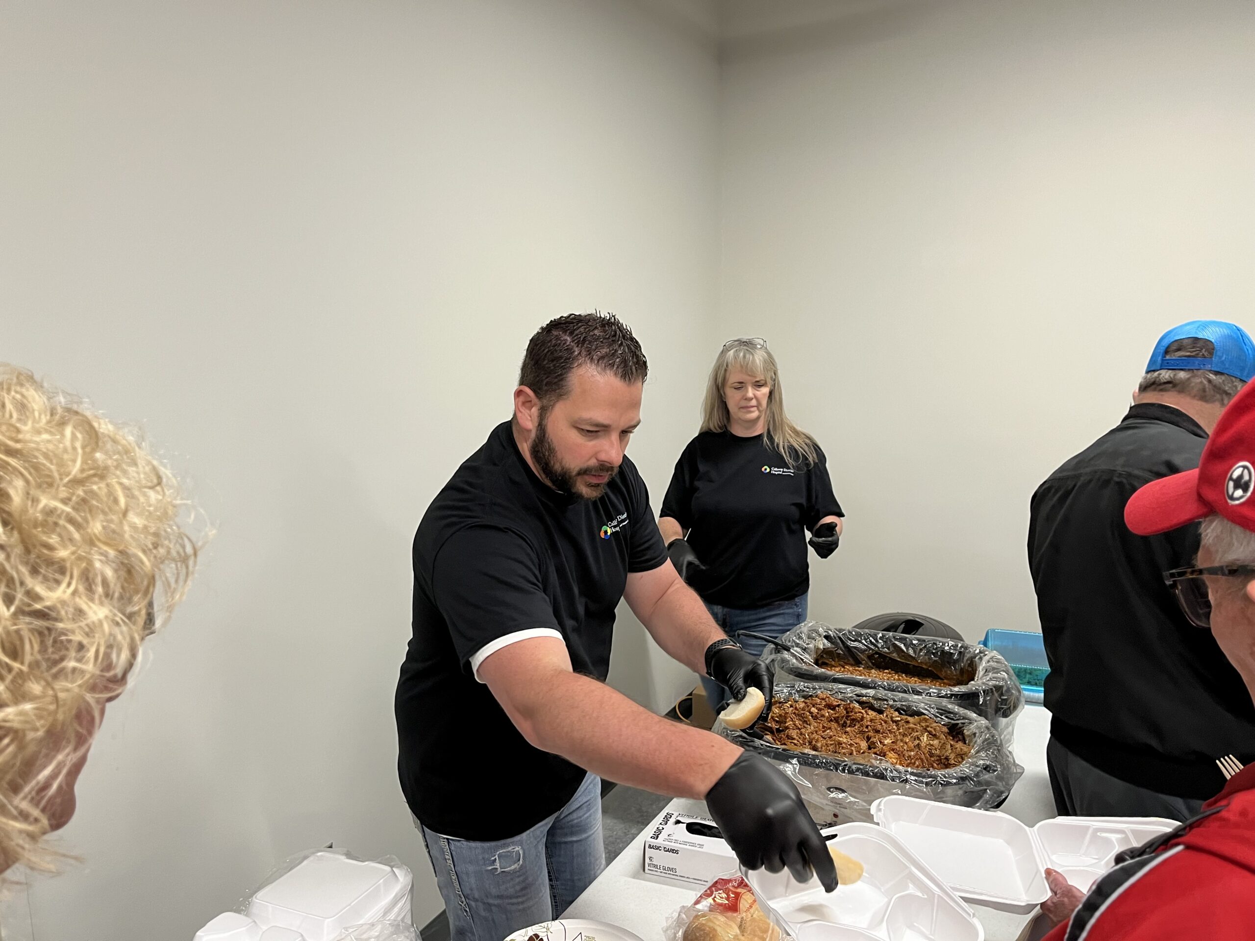Callaway District Hospital’s Caleb Moore serves pulled pork for the Hospital Appreciation Week celebration.