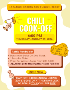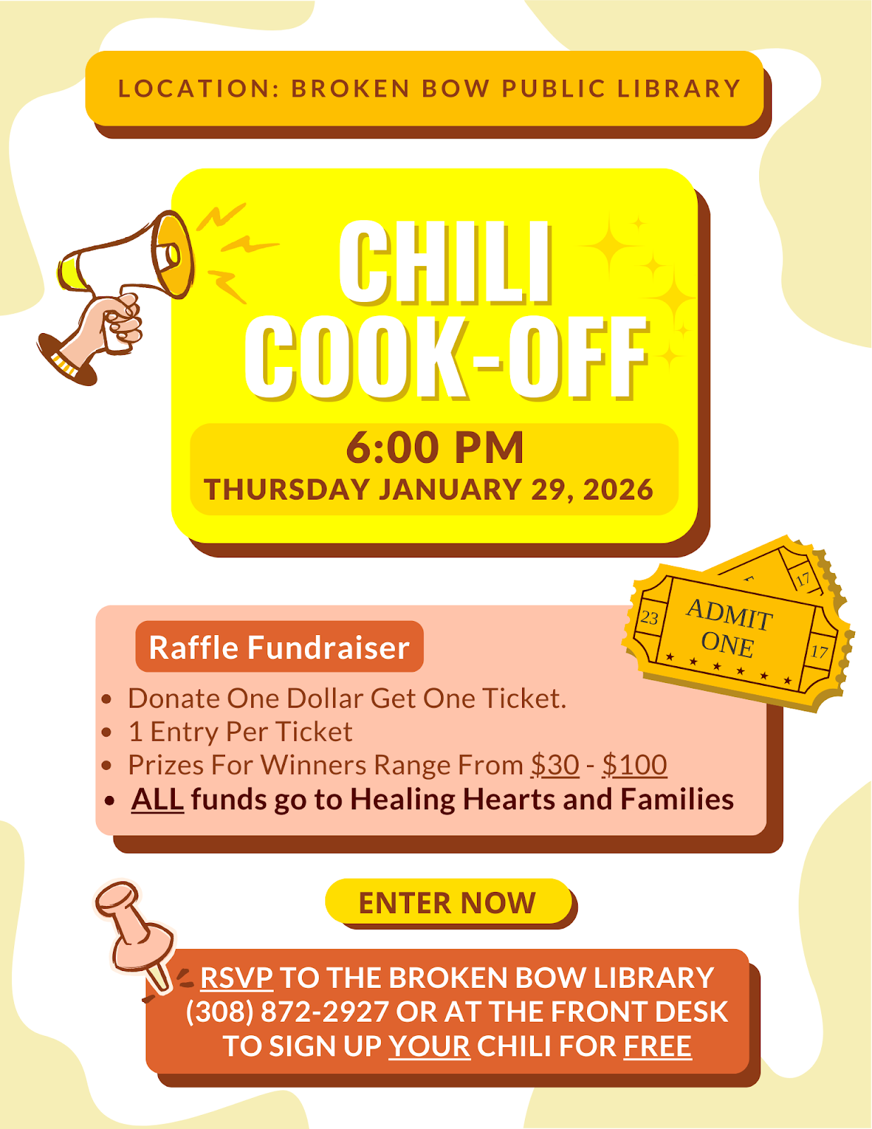 To enter a chili in the cook-off, register with the Broken Bow Public Library by calling 308-872-2927, or register in person at the library front desk. Signing-up to enter a chili in the contest is free.