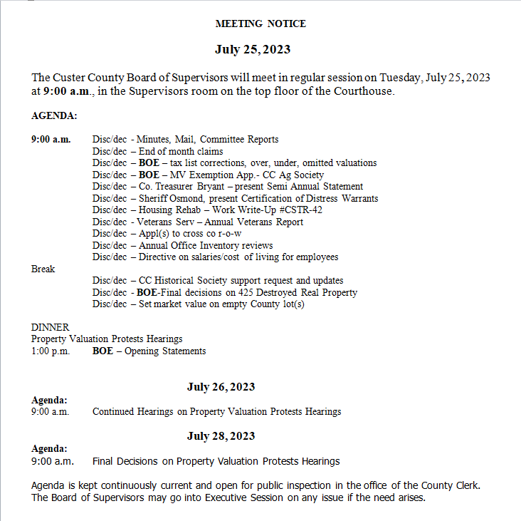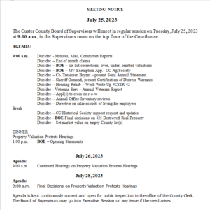 BROKEN BOW – The Custer County Board of Supervisors will hold its final meeting of the month tomorrow, July 25 at 9 a.m. on the top floor of the Custer County Courthouse.