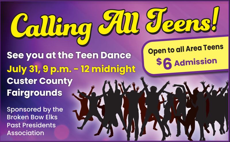 From 9 p.m. to midnight, local teens are invited to attend the Teen Dance. The dance will be at the Custer County Fairgrounds with a $6 admission fee.