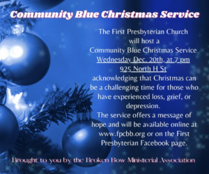 BROKEN BOW – On Wednesday at 7:00 p.m., at The First Presbyterian Church, the Broken Bow Ministerial Association will host a Community Blue Christmas Service.
