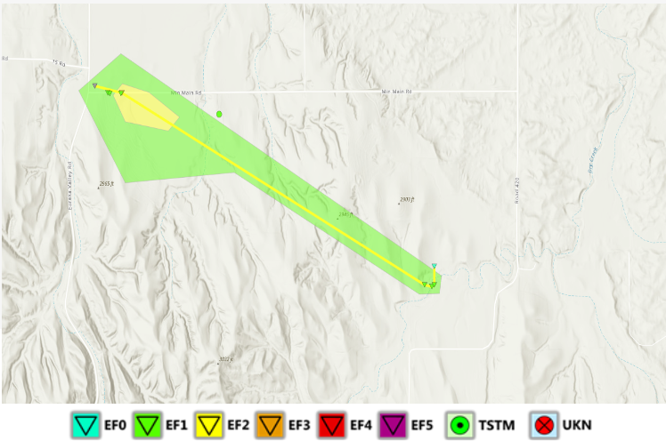 The tornado featured estimated peak wind speeds of 120 MPH and a path length of 1.82 miles, as well as a max width of 50 yards. The EF-2 rating was determined through damage to a row of powerlines and extensive damage to an irrigation system.