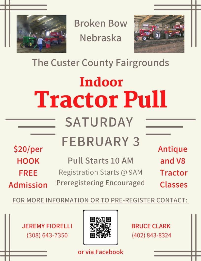 For new business, a tractor pull will be taking place on February 3 at 10:00 a.m. in the Indoor Arena. Registration will begin at 9:00 a.m. Pre-registering is encouraged. You are welcome to call Jermy Fiorelli at 308-643-7350 or Bruce Clark at 402-843-8324. There is no cost for admission but if you are interested in participating, the cost is $20 per hook. There are Antique and V8 tractor classes. Concessions will also be available.