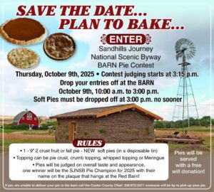 Again, plan to enter your fruit or soft pie in the Sandhills Journey National Scenic Byway Barn Pie Contest on Thursday, October 9. Or, plan to come and taste pies that are sure to please starting at 3:15. More details, including pie contest rules and submission can be found on the Sandhills Journey National Scenic Byway Visitor’s Center Facebook page.