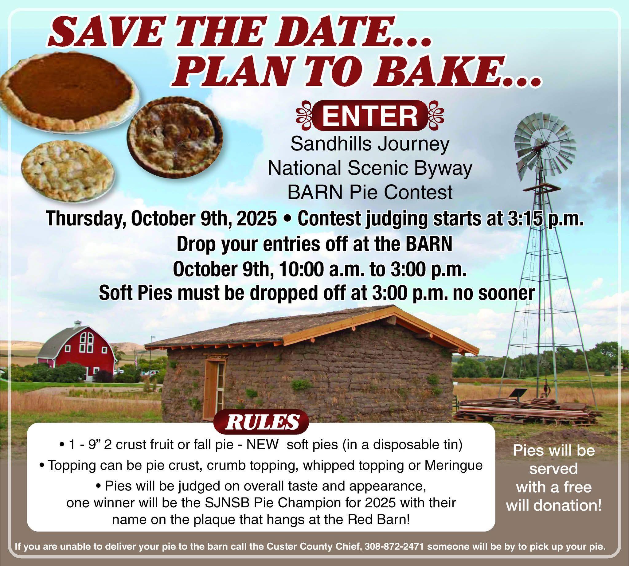 Pies will be judged on overall taste and appearance, and one winner will be the Sandhills Journey National Scenic Byway Pie Champion for 2025 with their name on the plaque that hangs at the Red Barn.