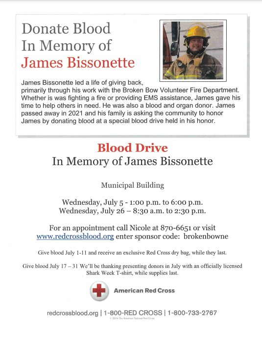 BROKEN BOW – The Bissonette family, in collaboration with the Red Cross, will be holding a pair of blood drives to honor the memory of Broken Bow firefighter James Bissonette.