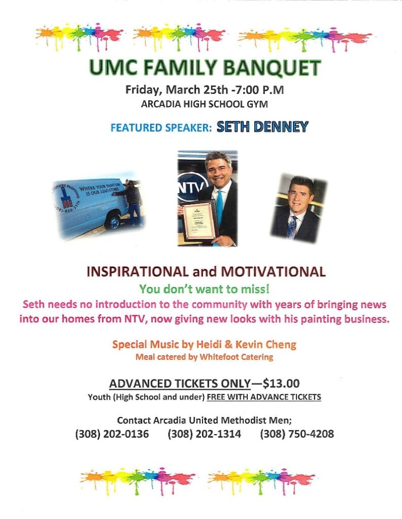 ARCADIA–The 36th Annual Arcadia Family Banquet will be held on Friday, March 25 at 7 p.m. The United Methodist Church (UMC) event will take place in the Arcadia High School Gym and will feature a newsworthy keynote speaker–Seth Denney.
