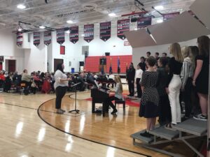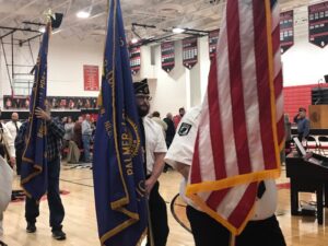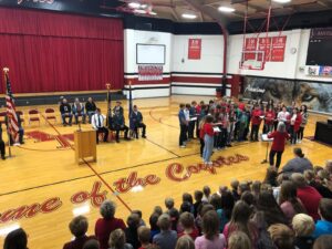 The high school band played the Star Spangled Banner and Manhattan Beach while the high school choir sang A Tribute to the Armed Services and Stand By Me. “The Noble and the Brave: A Veterans Day Tribute” by Joanna Fuchs was read followed by a moment of silence, Taps, and the retiring of the colors.